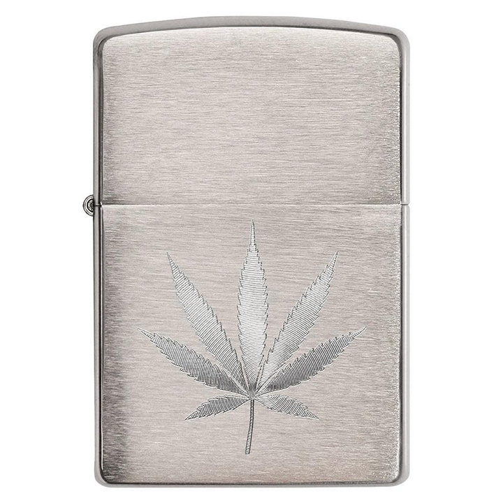 This model features a simple marijuana leaf auto engraved on the surface of a classic Brushed Chrome lighter Comes packaged in a gift box. For optimal performance, fill with Zippo lighter fuel.